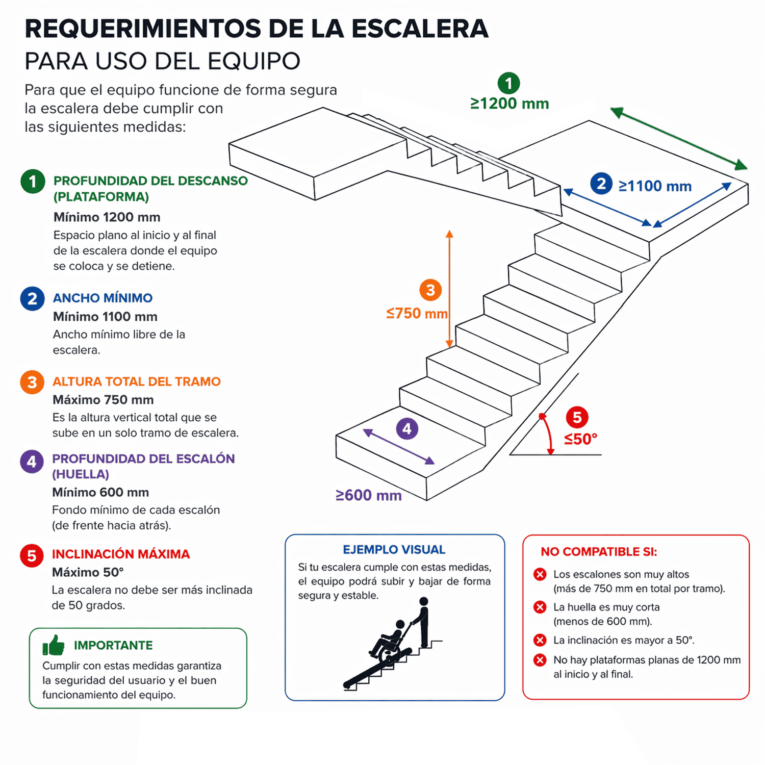 Para garantizar un funcionamiento seguro, la StairPro requiere que la escalera tenga una geometría adecuada para su sistema de orugas.